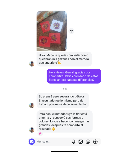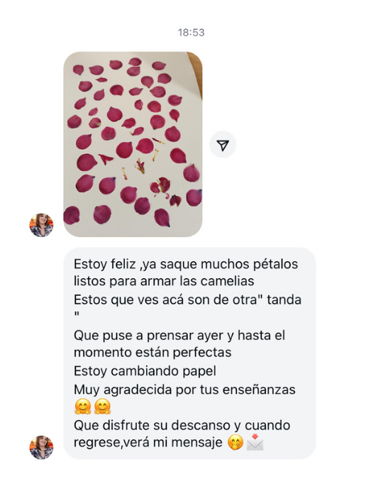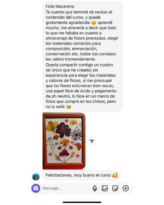 Las flores me enseñaron disciplina y que la técnica es la base de la calma. Hoy, enseño mi Método de prensado floral para que miles de mujeres puedan crear con confianza, orgullo y un acabado profesional.